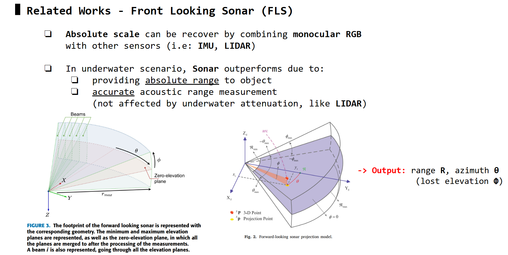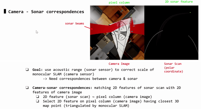 - absolute sonar measurements can correct scale of monocular SLAM, but needs to obtain camera-sonar correspondences -> understand how to obtain these correspondences