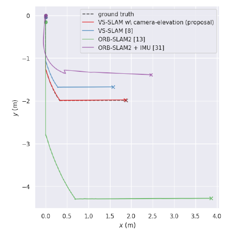 The above re-scaling code results in the final trajectory denoted VS_SLAM [8]. The approximation \(d_{true} / d_{est}\) ~ \(r / d_{est}\) is not accurate for close distances like in Close Visual Inspection (CVI) missions. In the next post, I will show you an improved rescaling ratio (VS_SLAM (proposal) in above figure) that can be applied for both close and far stand off distances between AUV and target object.