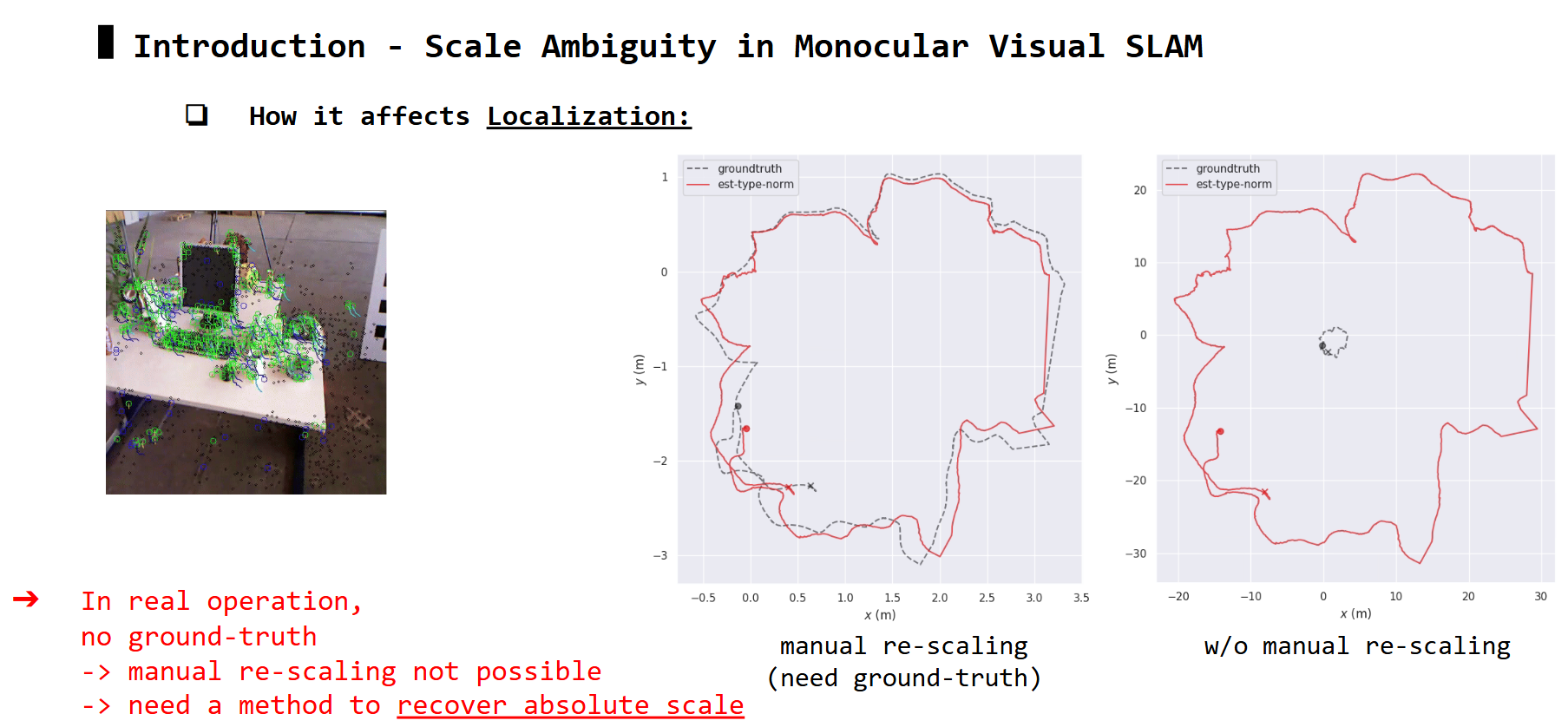 -> We need to match camera features with sonar features first (camera-sonar correspondences), making sure they are observing the same P, then use their relative geometry to estimate the scale \(d_{true} / d_{est}\)