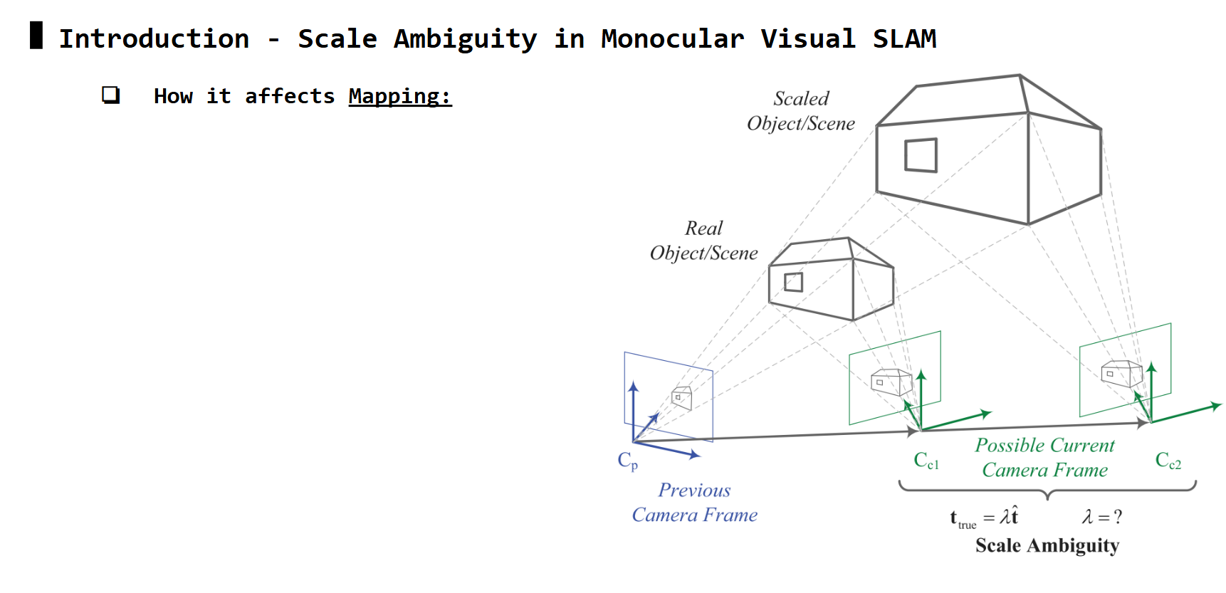 Matching features P1 and P2 may avoid ambiguity along epipolar line, but it still suffer from ambiguity along baseline. In this case, the solution of E in the epipolar equation can only be up to a scale, for the translation part (i.e: \(t_{true} = \lambda t_{est}\), can solve for \(t_{est}\) but not \(\lambda\) ). This is also known as scale ambiguity.