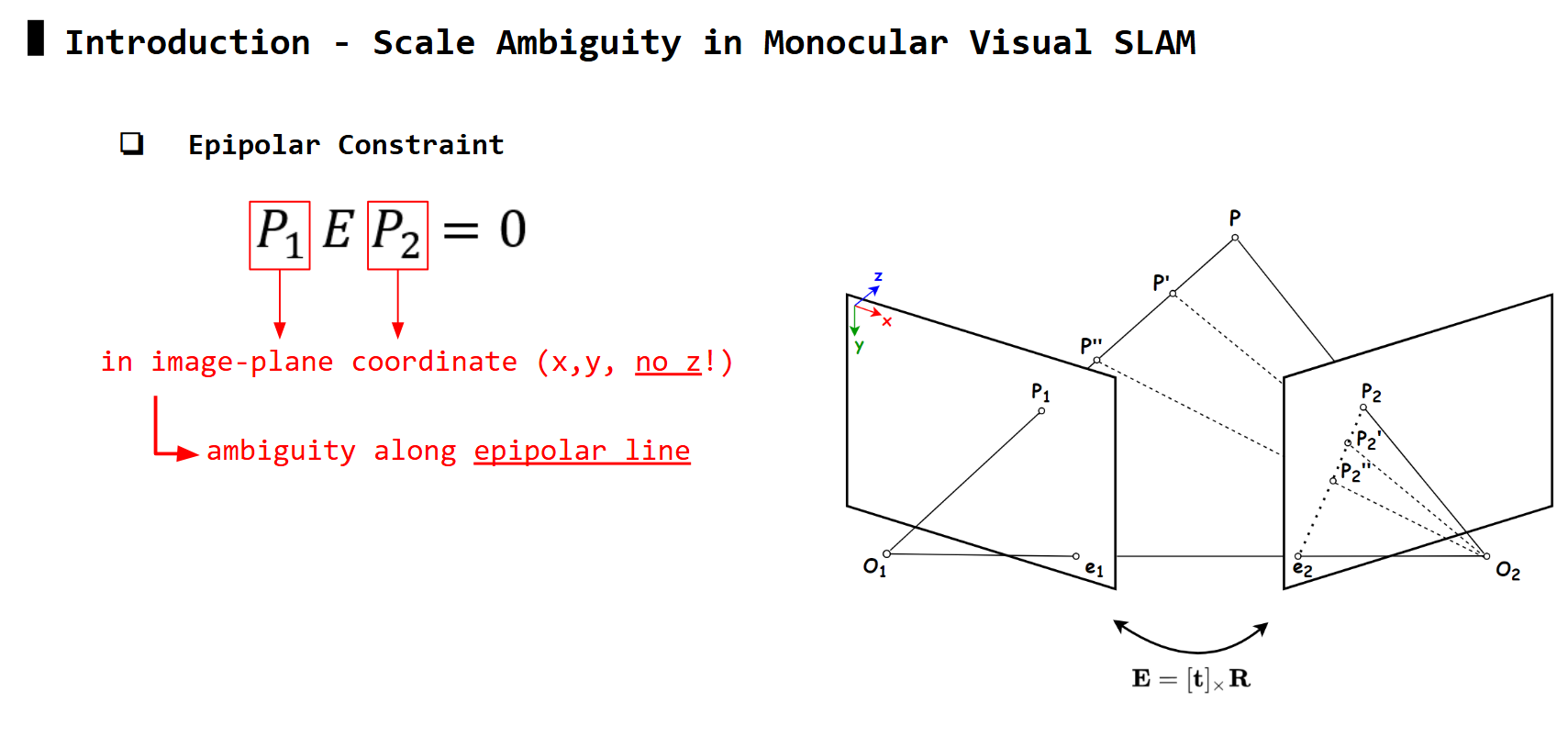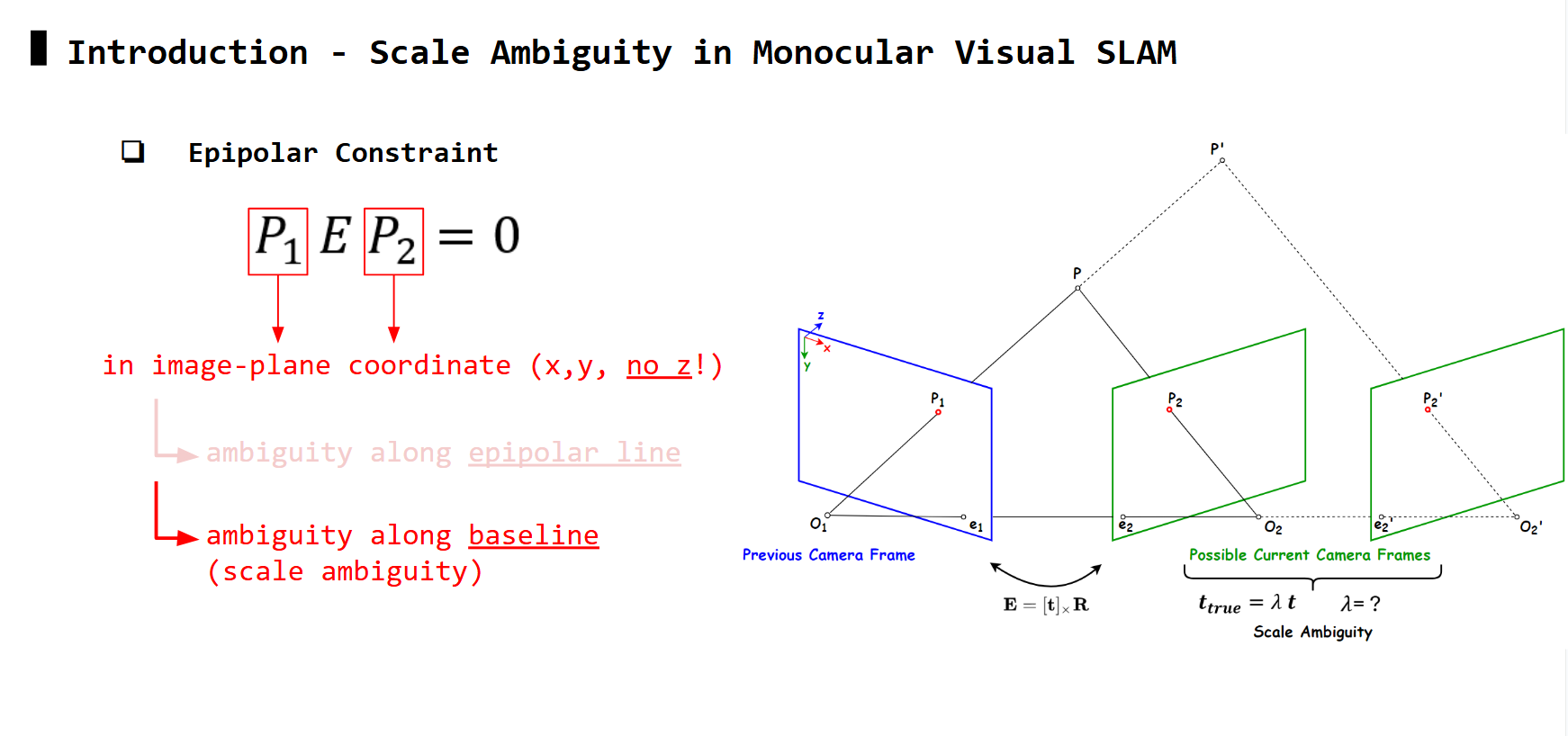 Matching features P1 and P2 may avoid ambiguity along epipolar line, but it still suffer from ambiguity along baseline. In this case, the solution of E in the epipolar equation can only be up to a scale, for the translation part (i.e: \(t_{true} = \lambda t_{est}\), can solve for \(t_{est}\) but not \(\lambda\) ). This is also known as scale ambiguity.