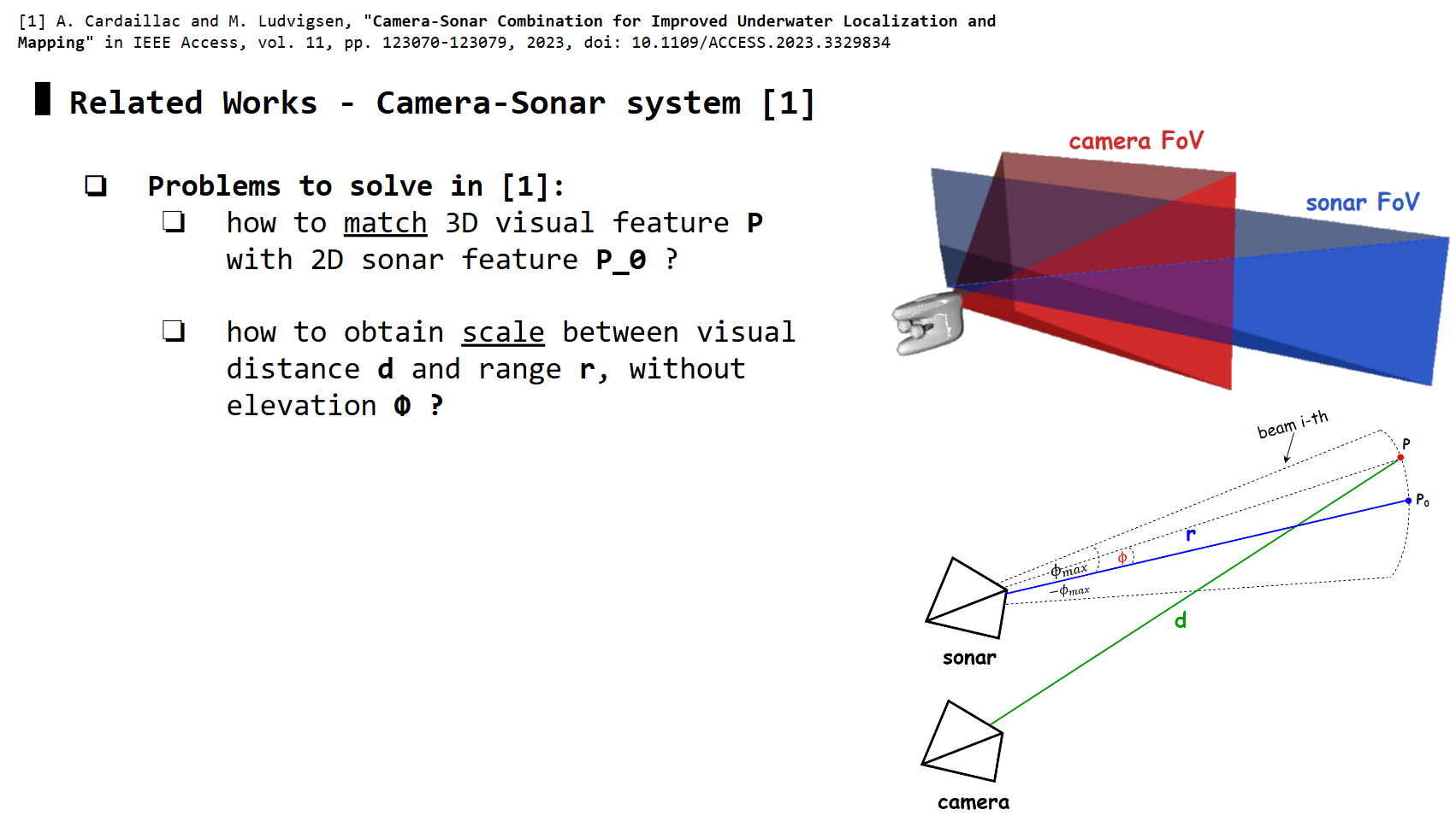 -> We need to match camera features with sonar features first (camera-sonar correspondences), making sure they are observing the same P, then use their relative geometry to estimate the scale \(d_{true} / d_{est}\)